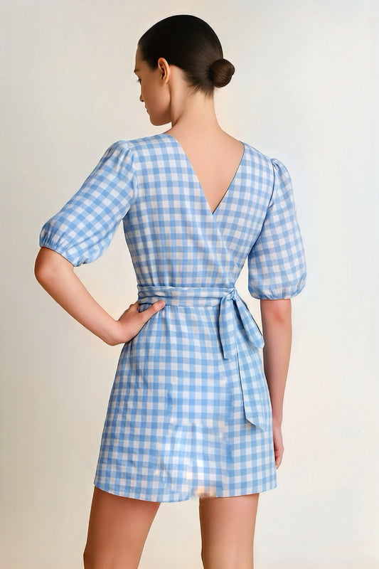 BELLA Cotton Wrap Dress in Blue Gingham